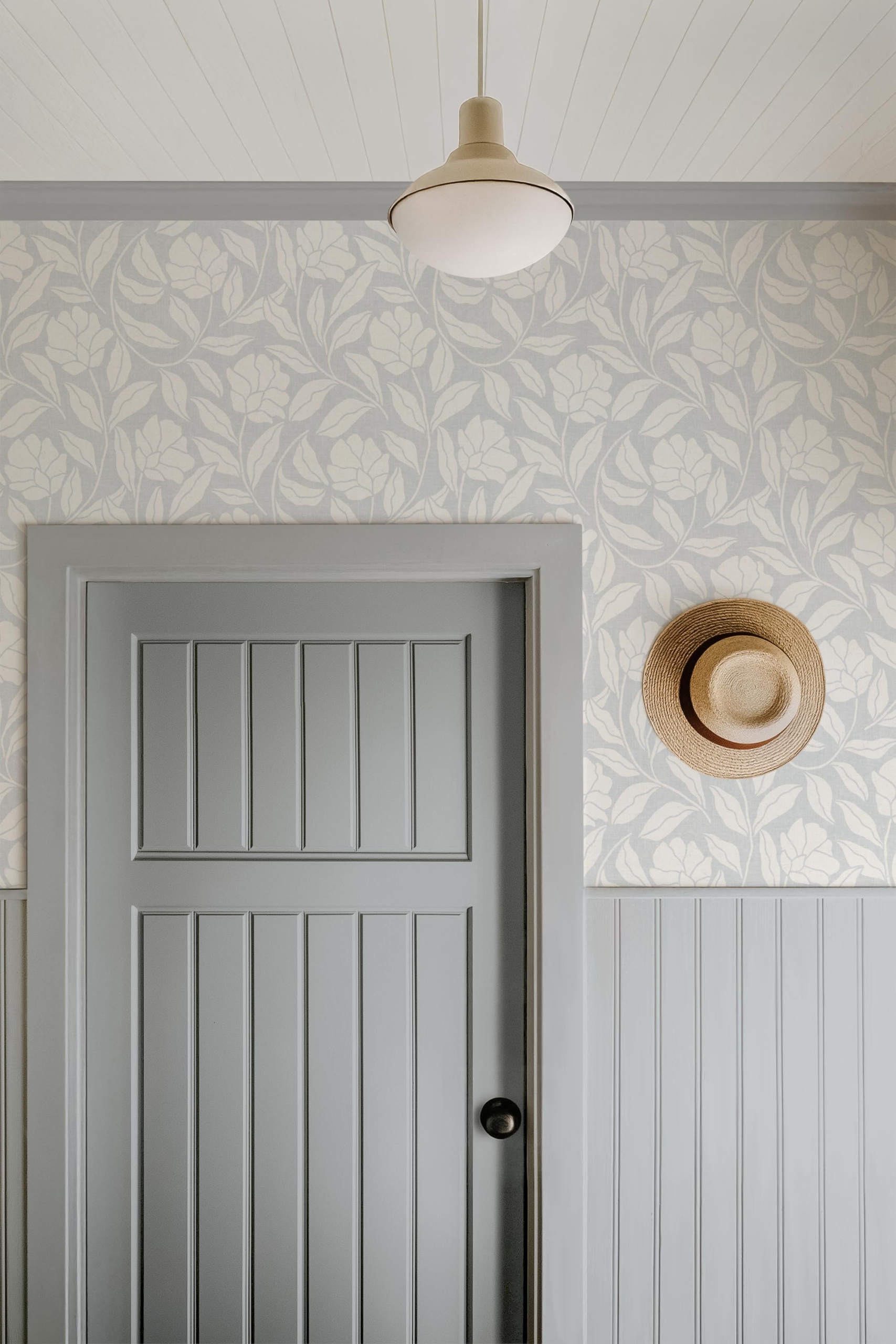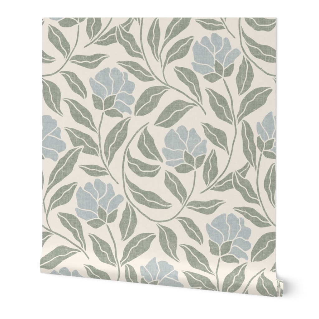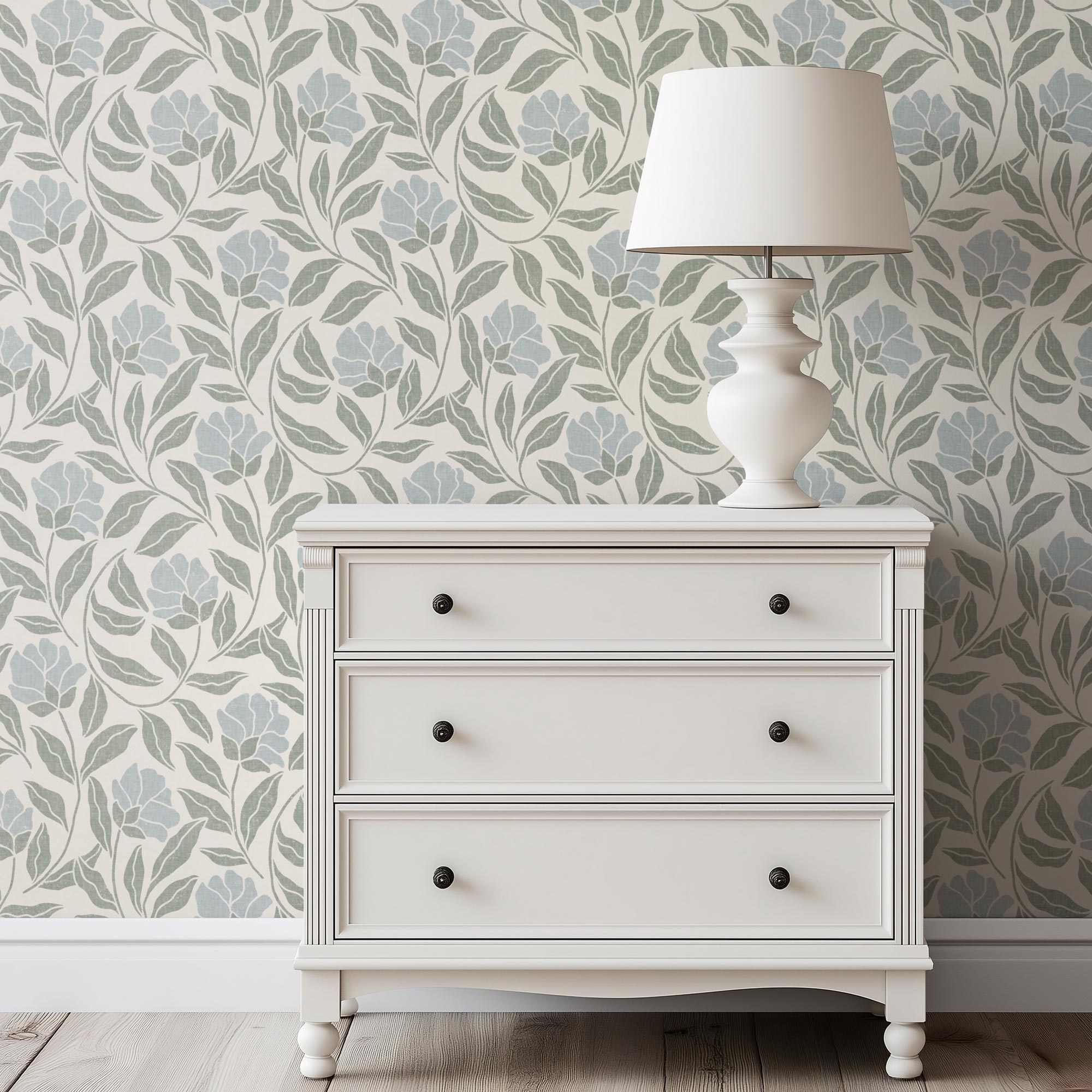 A classic botanical design with a decorative feel. This wallpaper suits traditional, cottage-style, and soft vintage interiors.