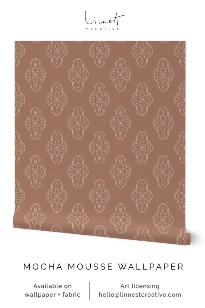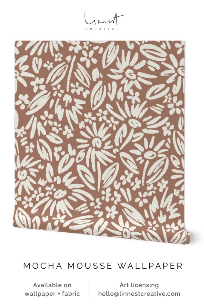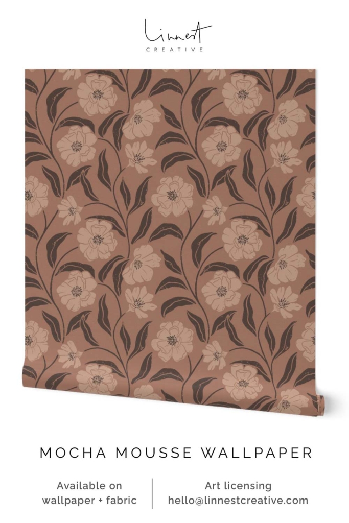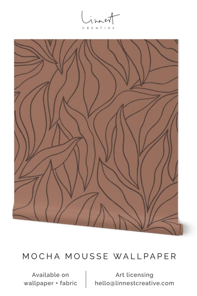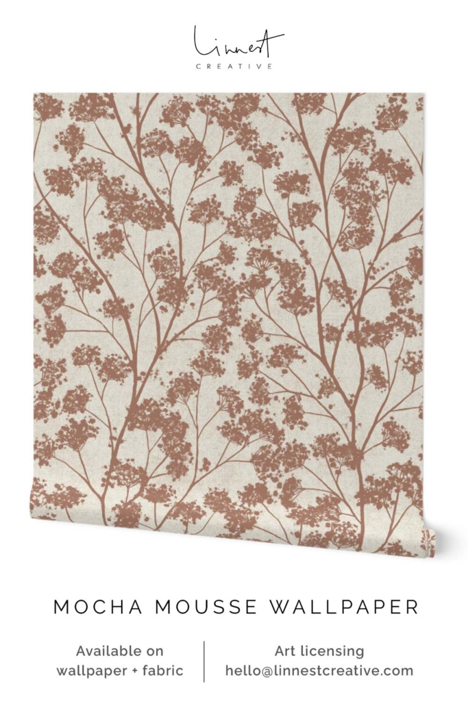 Mocha Mousse works beautifully on both fabric and wallpaper, offering a timeless backdrop that pairs well with modern minimalist style as well as rustic farmhouse or cottage-inspired décor.