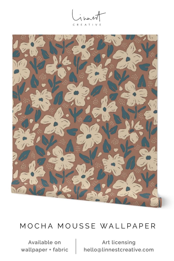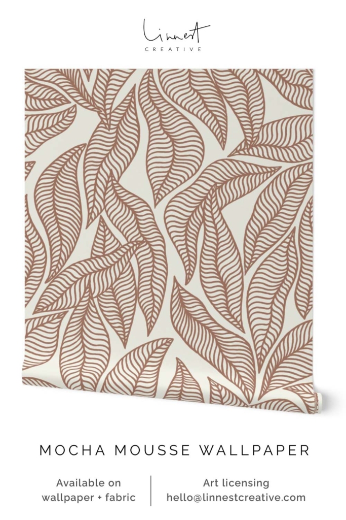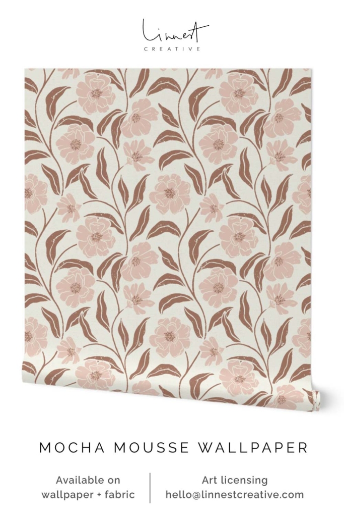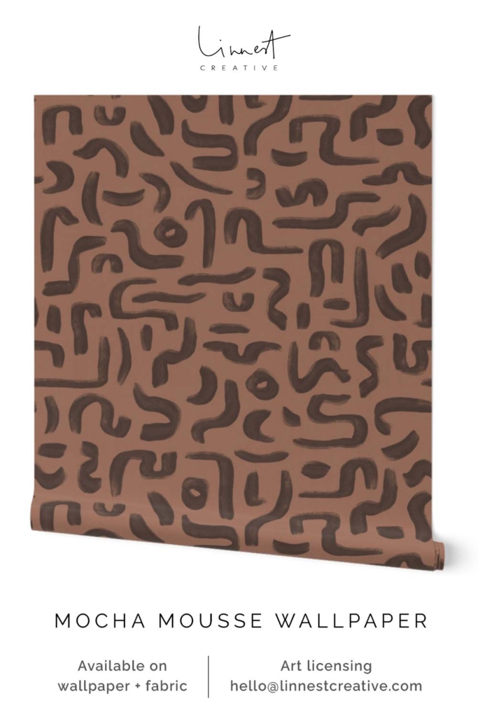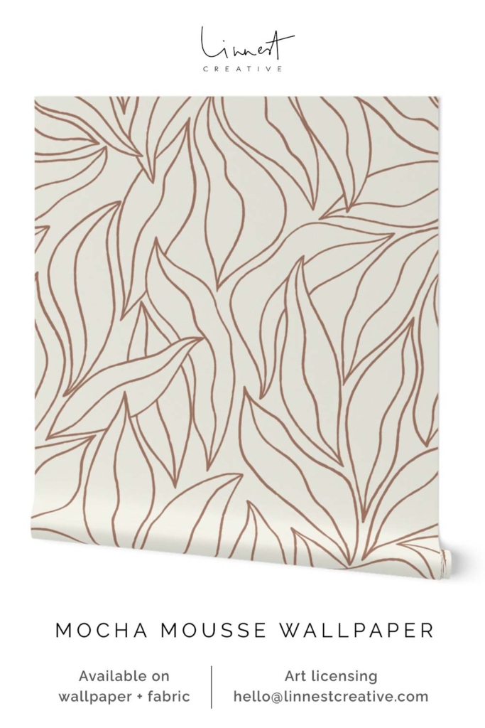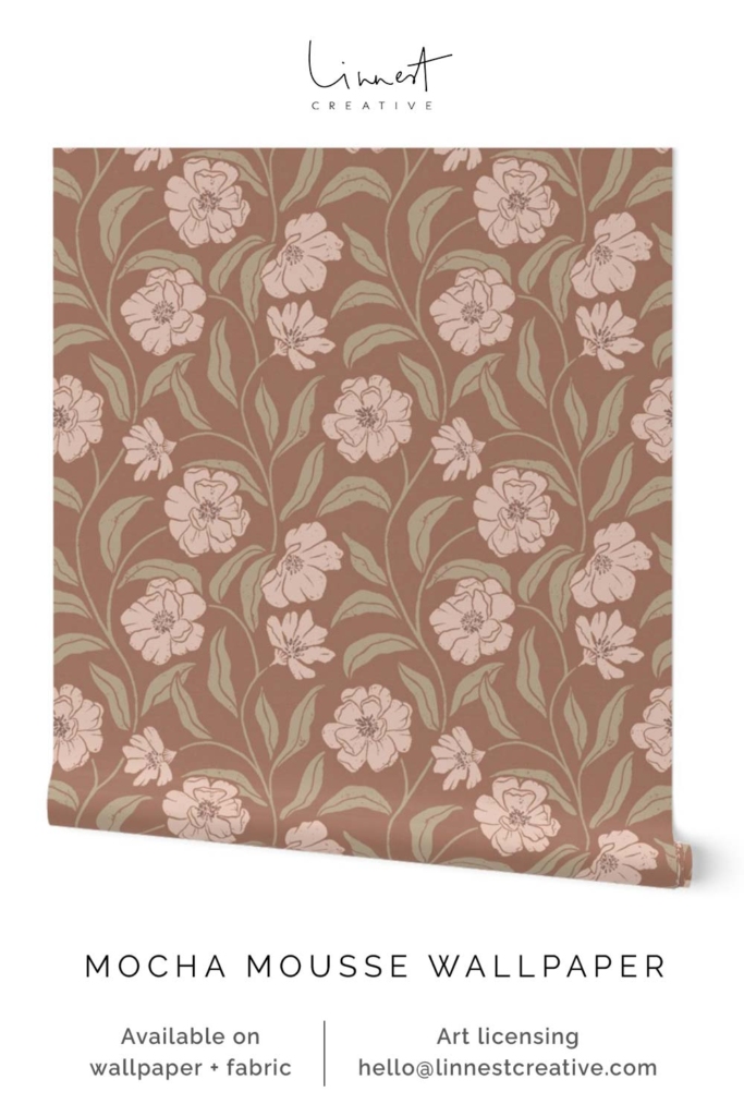Mocha Mousse works beautifully on both fabric and wallpaper, offering a timeless backdrop that pairs well with modern minimalist style as well as rustic farmhouse or cottage-inspired décor.